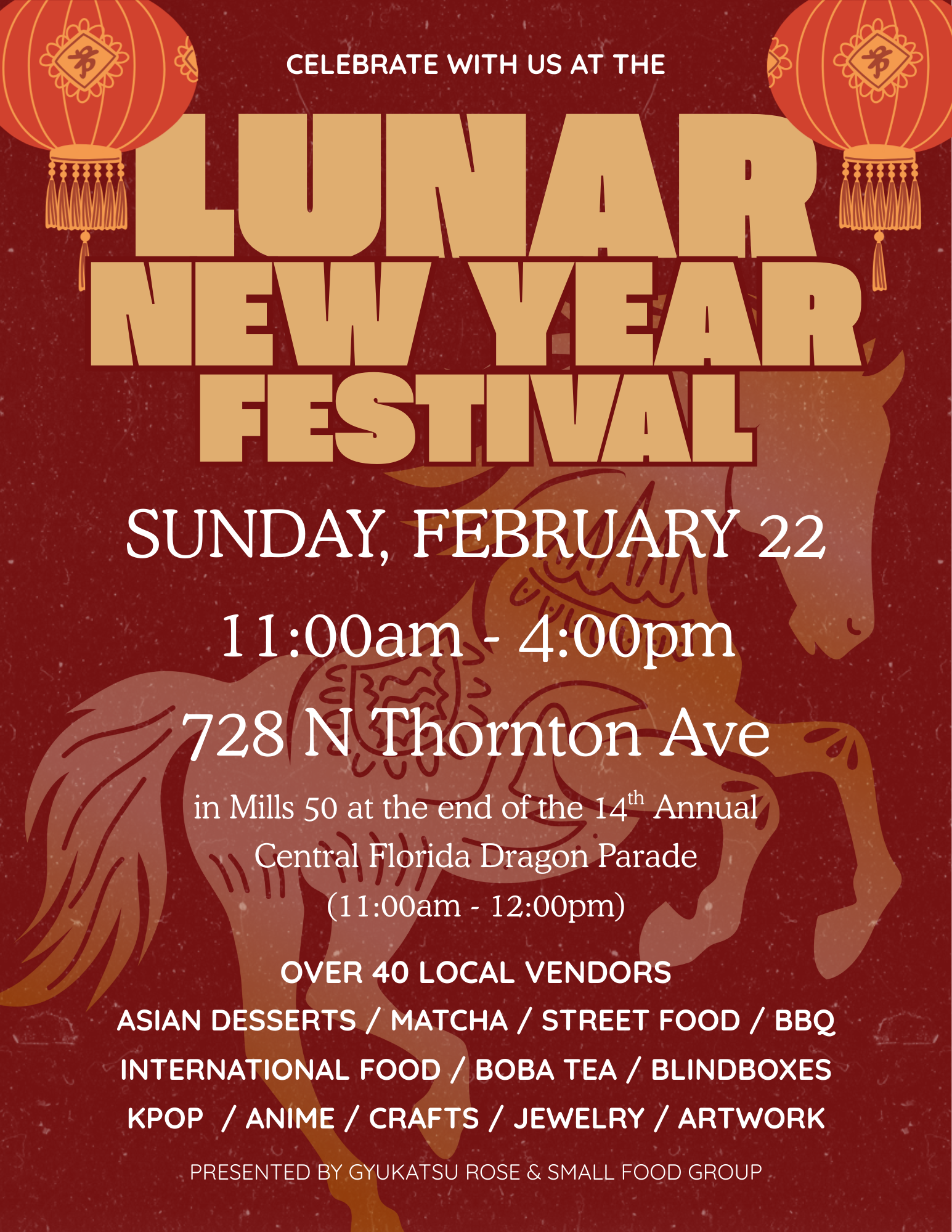 The parade will cross over Mills at Lake Highland and then travel on Thornton to Colonial Drive. Dignitaries including Orlando Mayor Buddy Dyer, City Commissioners Patty Sheehan and Roger Chapin, U.S. Congressman Maxwell Frost and others along with Orlando Magic, Universal Orlando, OUC, Dueling Dragons Dragon Boat Team, Wah Lum Temple and Orlando Taiko Dojo will be in the parade. Following the parade. the Lunar Festival will take place at 728 N Thornton (Edoboy parking lot) until 4pm. Over 40 local vendors will be on hand with delicious food & drink, art, jewelry and more.